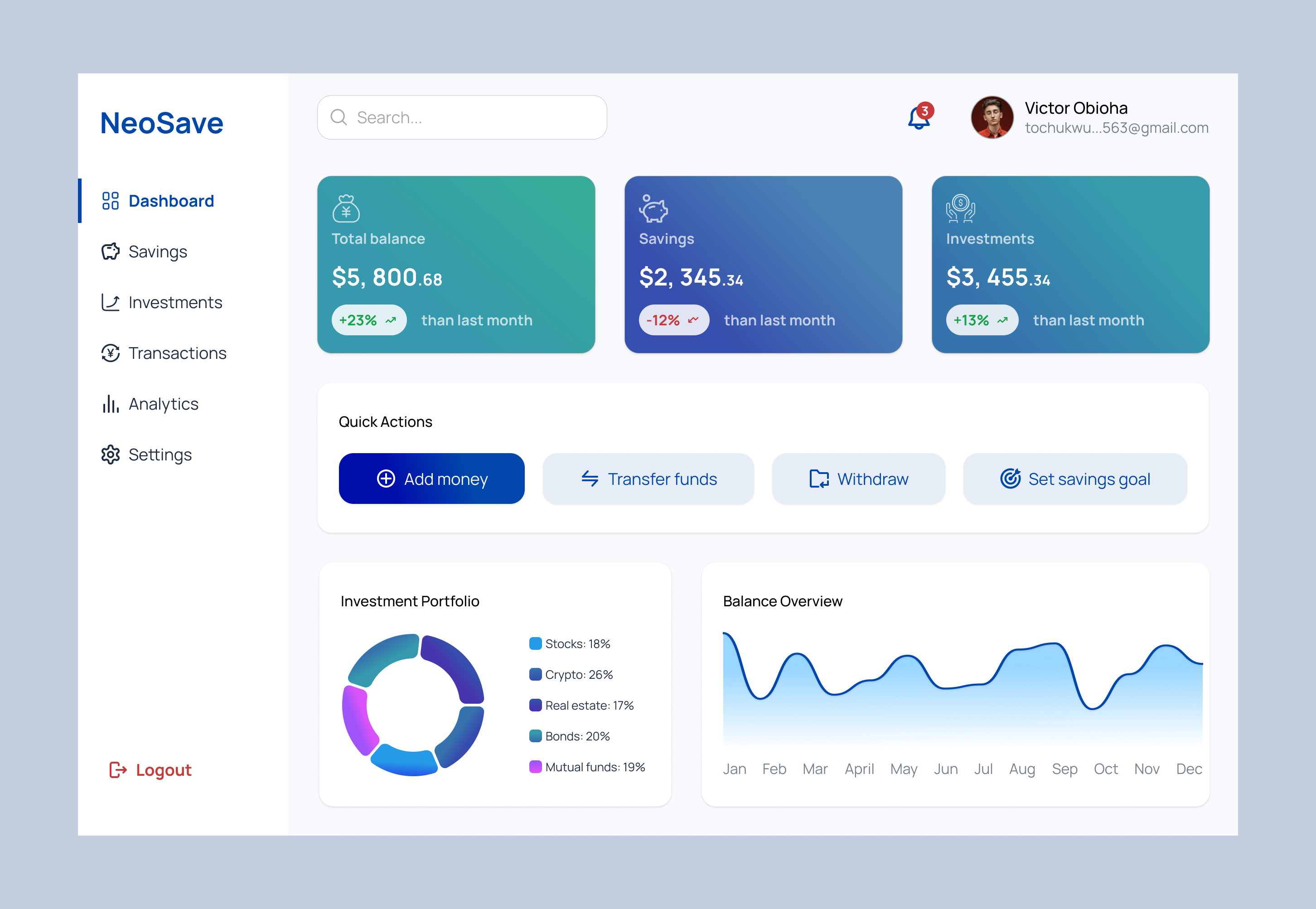 Dashboard designed to help users track their finances, with quick actions (add money, transfer funds), an investment portfolio (stocks, crypto, real estate, mutual funds), savings goals, and recent transactions.